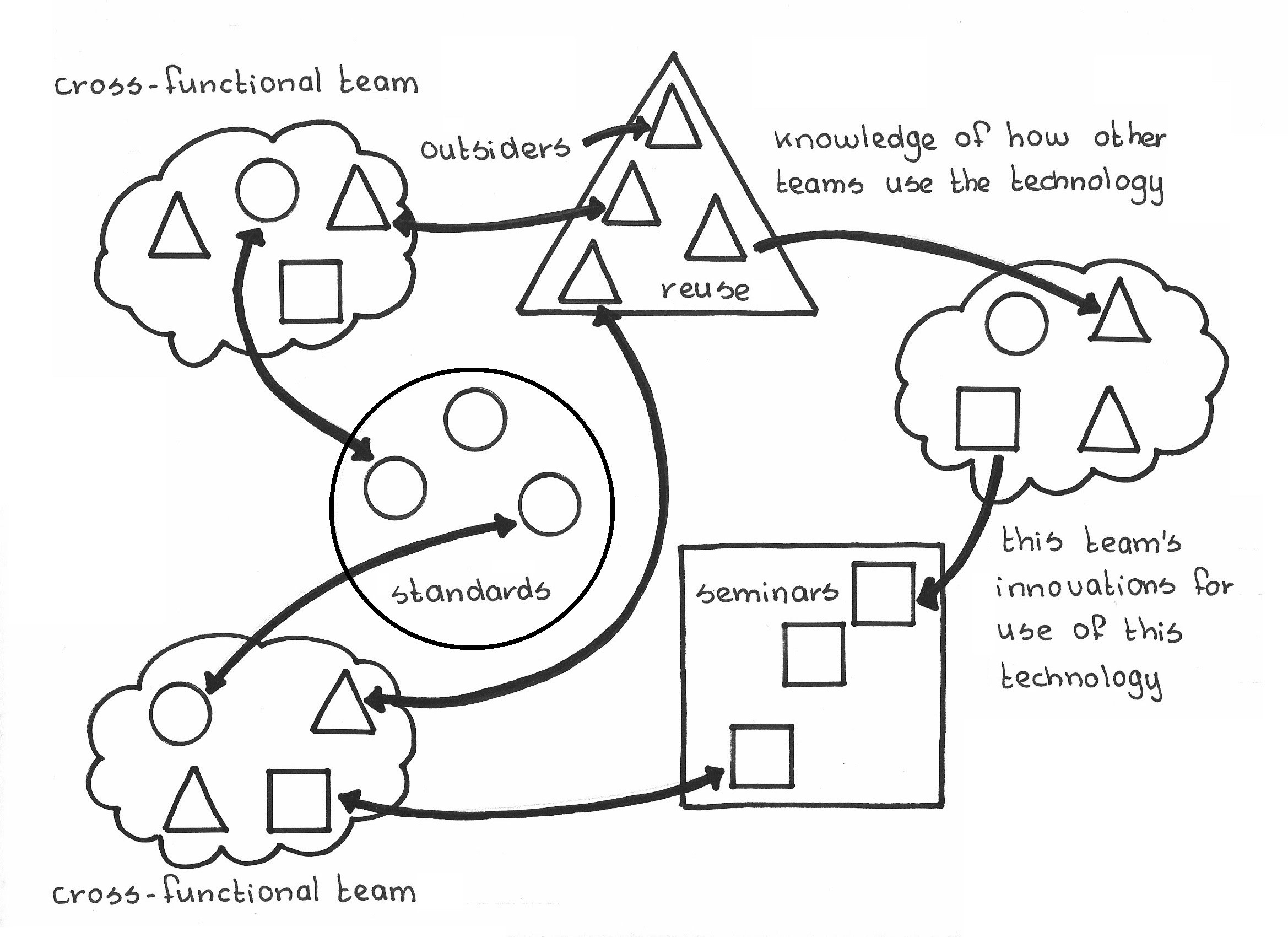 In 1991, Lave and Wenger introduced the concept of Communities of Practice [5] to describe the theory of situated learning which, in short, is about individuals acquiring professional skills through social co-participation (from Wikipedia [6]). Spotify has several structures in place called tribes, chapters, and guilds that provide a natural place for various flavors of cross-team fertilization (as related by Henrik Kniberg [7]). Siili Solutions in Helsinki calls such groups tribes. Progress Software in the United States used such a group to select a single defect tracking tool for all teams to use, so that everyone in the whole organization knew where to find and report defects.