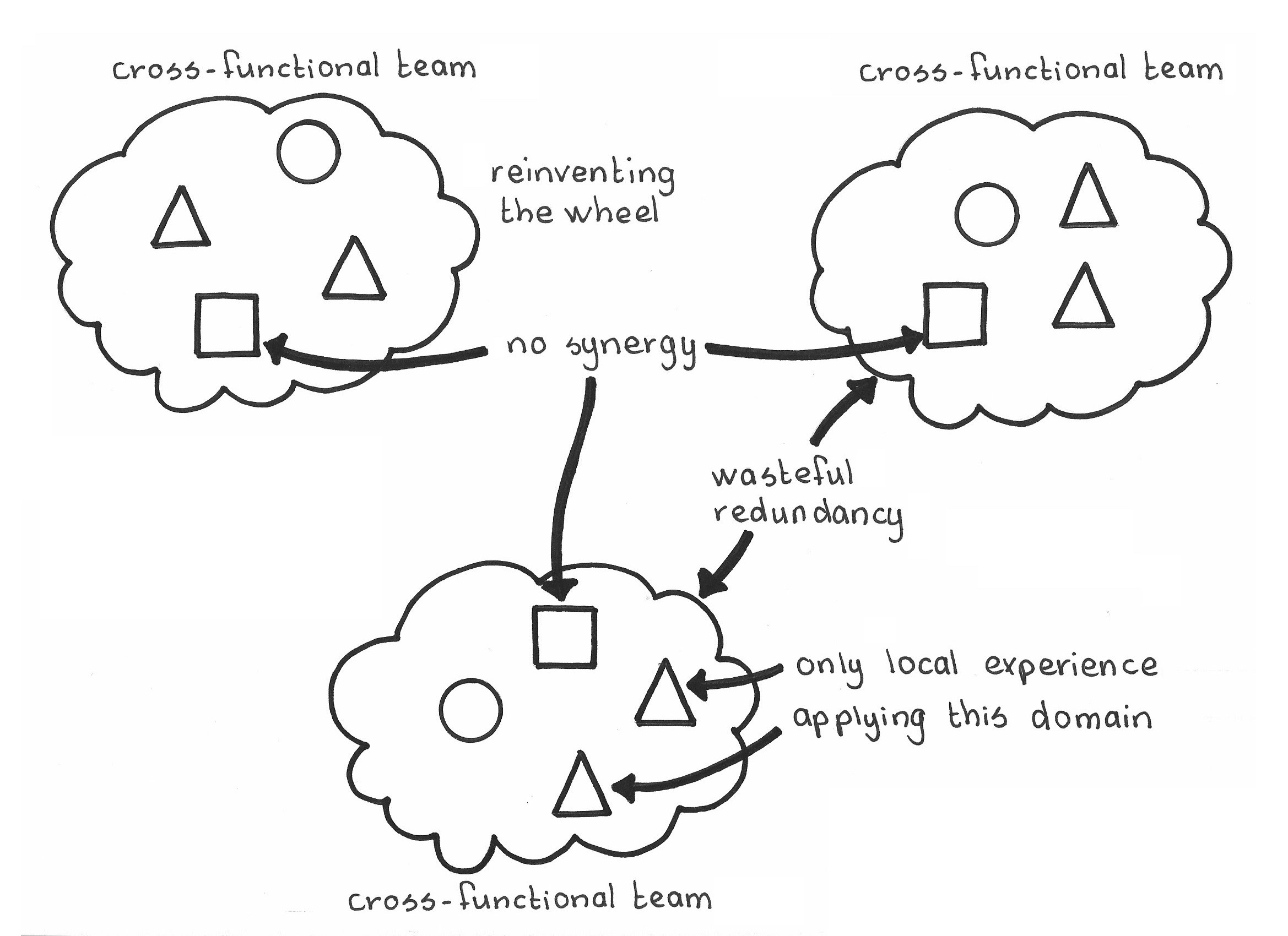 ...the Scrum organization and its roles are in place. Development Teams are working effectively as Autonomous Teams to build product. They are Cross-Functional Teams, and the expertise in individual teams grows only through the insights that each team gains from its own work.