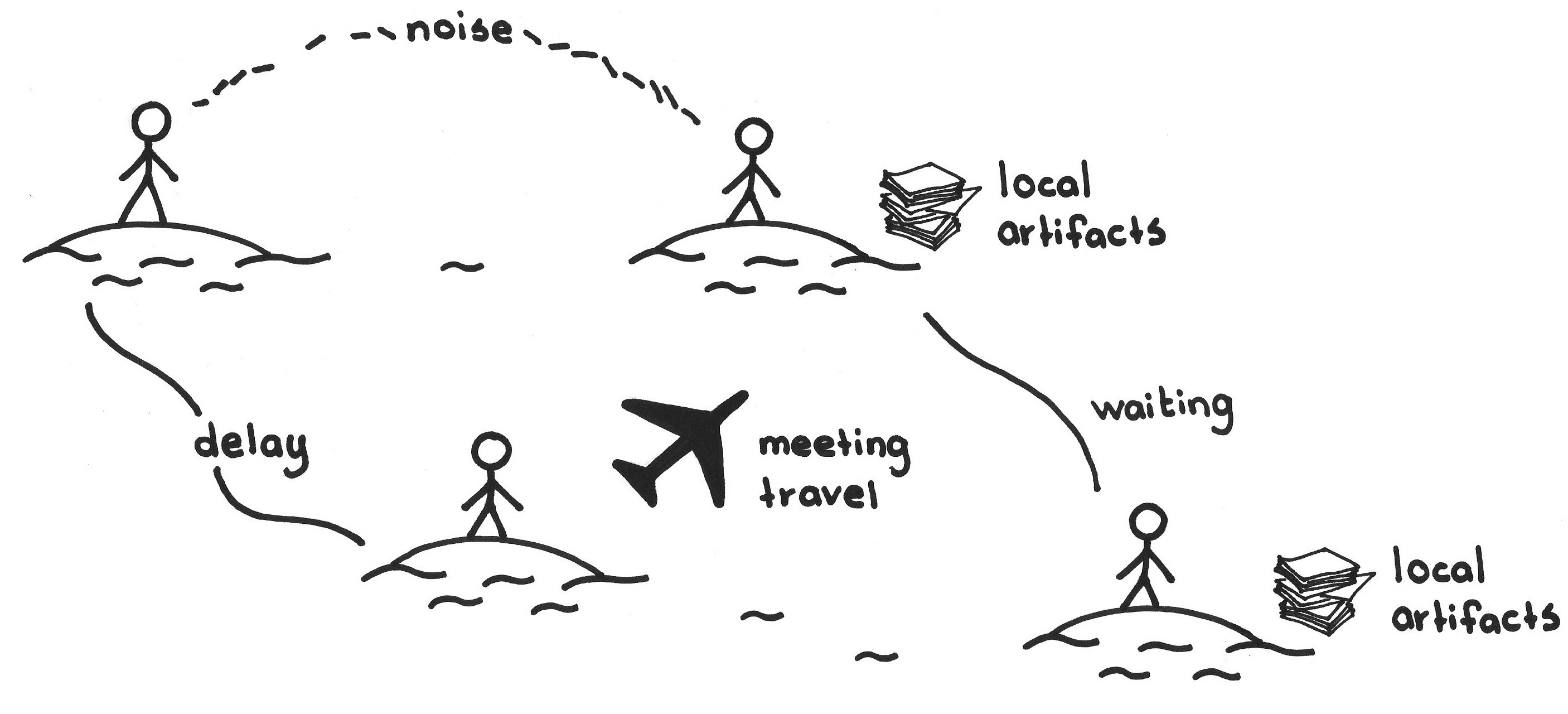 Even more powerful than distance are features of the building architecture; being in different offices is a liability, in different hallways a serious liability, on different building levels an extreme liability, and in separate buildings a disaster. We have heard the CEO of one of the world’s largest telecommunications companies say that their popular telecommunications product is not a tool suitable to supporting multi-site software development.