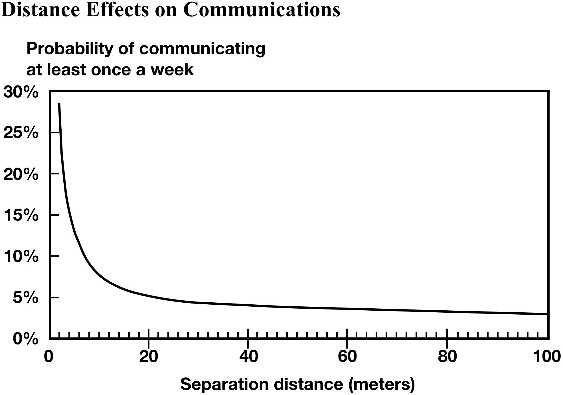 The Allen Curve from 1977 shows that when people separate to a distance of 10 meters their probability of communicating at least once a week is less than 10 percent ([3]). Despite recent developments in communication technology, Allen has said this has not improved: