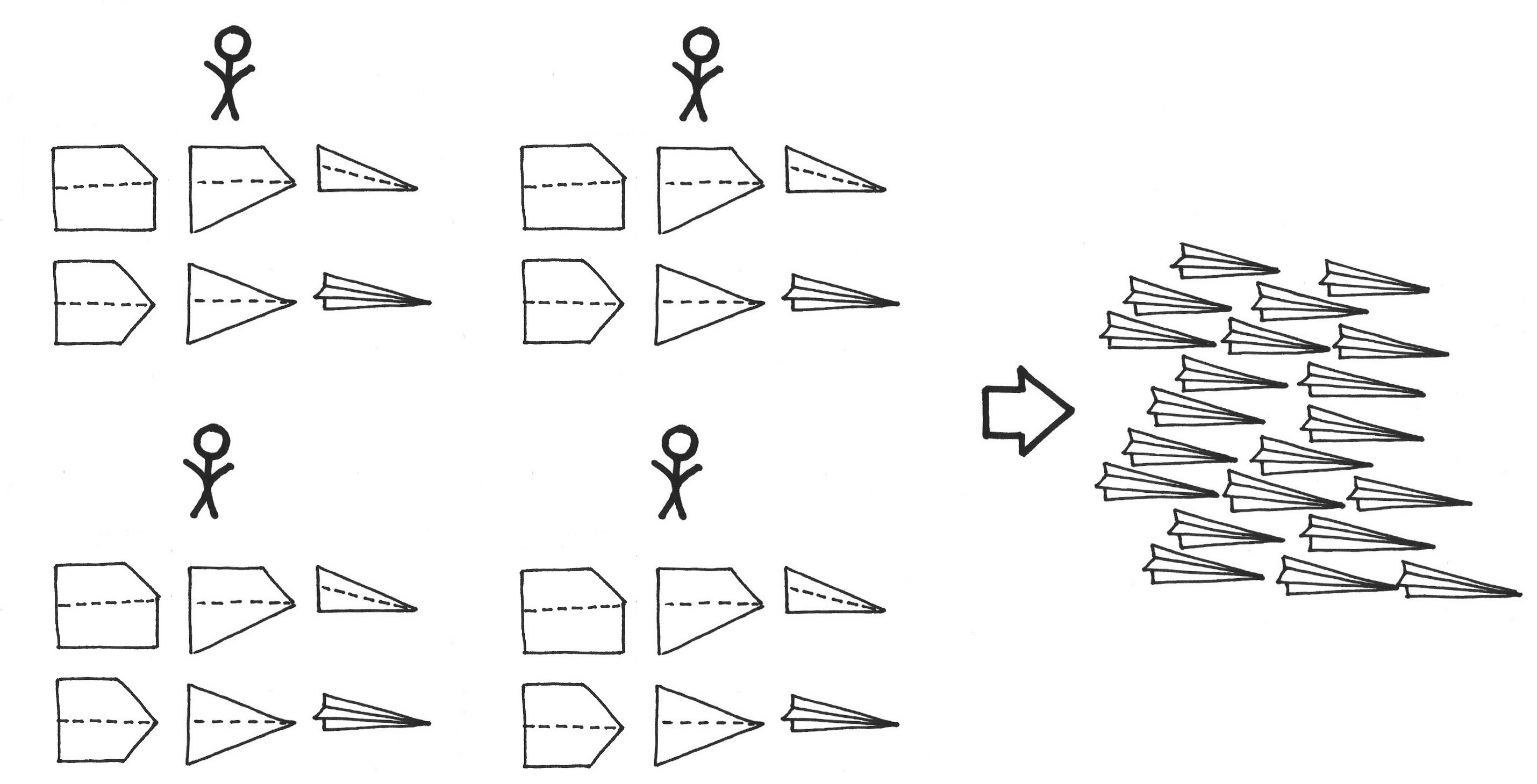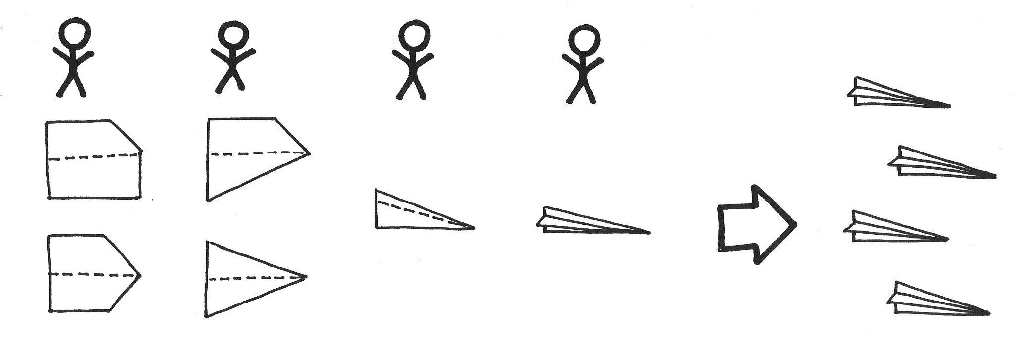 Assemble several small teams who will compete in a game to make and fly paper airplanes. Each team member may make only one fold at a time, and then must switch to work on another plane. No plane may have more than 15 folds. It must be at least 15 centimeters long and 8 centimeters wide. It must have a blunt tip at least 2 centimeters wide. To qualify as a quality product the plane must fly 3 meters horizontally when the tester tests it. The tester may test each plane only once.