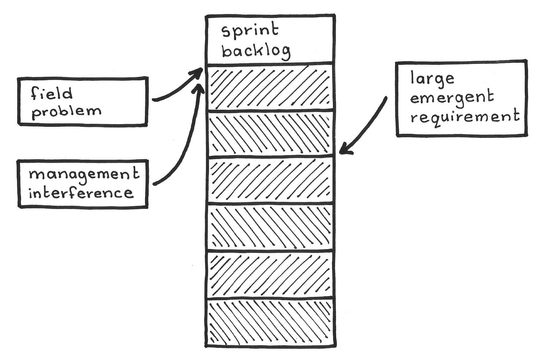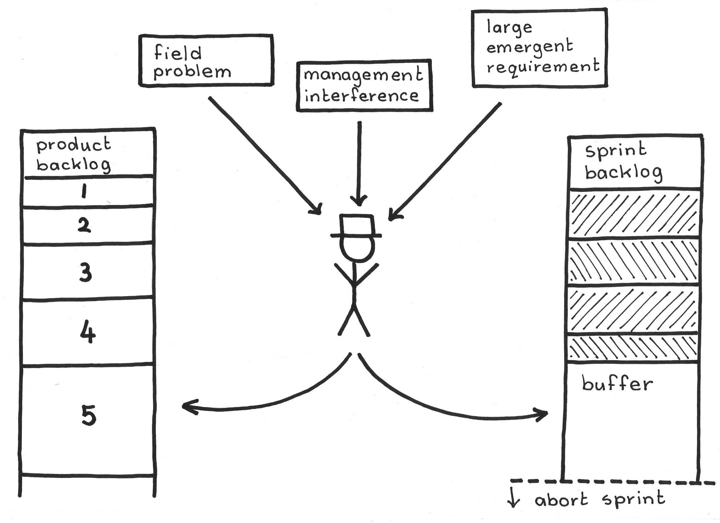 Changing priorities or problems in the field often interrupt the work of Scrum Teams during a Sprint. Sales and marketing demands, combined with management interference, can cause chronic dysfunction in a team, repeated failure of Sprints, failure to meet release dates, and even company failure.