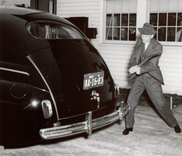 Henry Ford testing a car he envisioned (by hitting it with an ax), and which his company built—from hemp