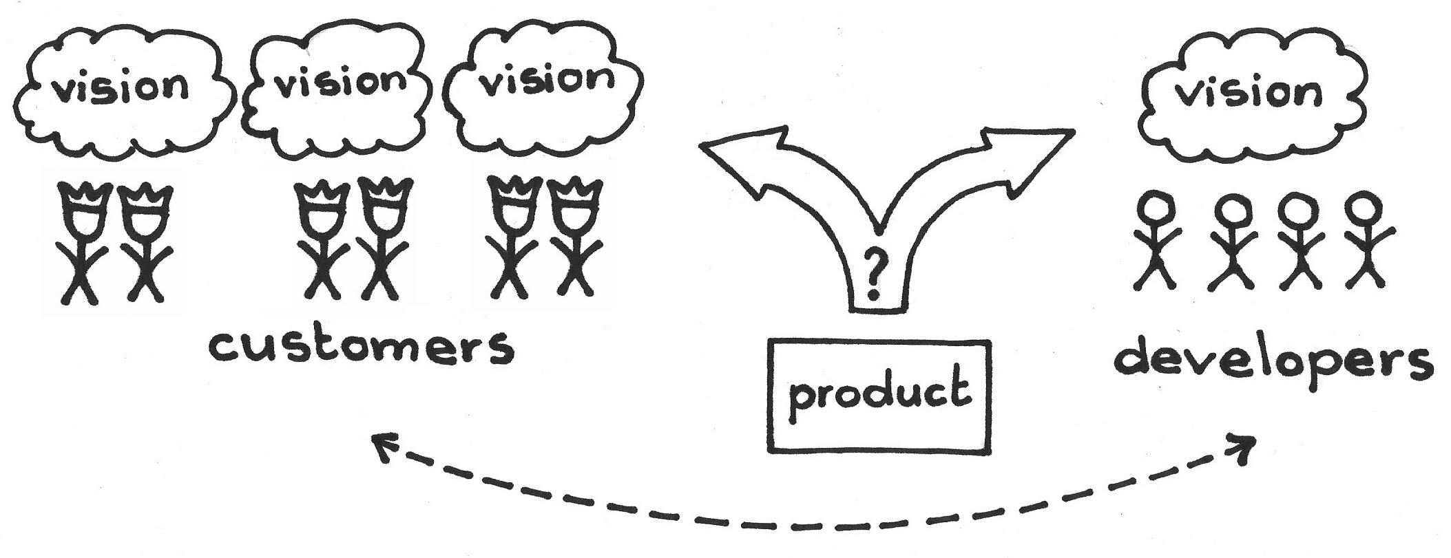 There is no customer in Scrum. The customer role is present in many real-world value streams. Scrum tends to reflect the Lean vision of partnership between the business and end user, rather than a relationship of animosity or of at-arms-length or over-the-wall communication; see Development Partnership. Customers can realize paths to market, but the enterprise should be mindful that customers are an added handoff that can introduce delay and waste. These often are impediments for the Product Owner to remove. In Scrum, the Product Owner represents the interests of all stakeholders, including customers (see Surrogate Customer). The Product Owner manages all business relationships external to the team, which eliminates handoffs between the business vision and the development effort.