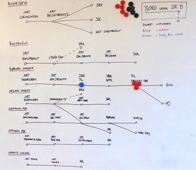 The application-systems were managed by different departments and teams. At every Retrospective the board showed which features could not be completed and which application-system was blocking delivery. The teams used red magnets for ``broken'' application-systems, black magnets for ``stubbed'' application-systems and blue magnets for ``working'' application-systems.