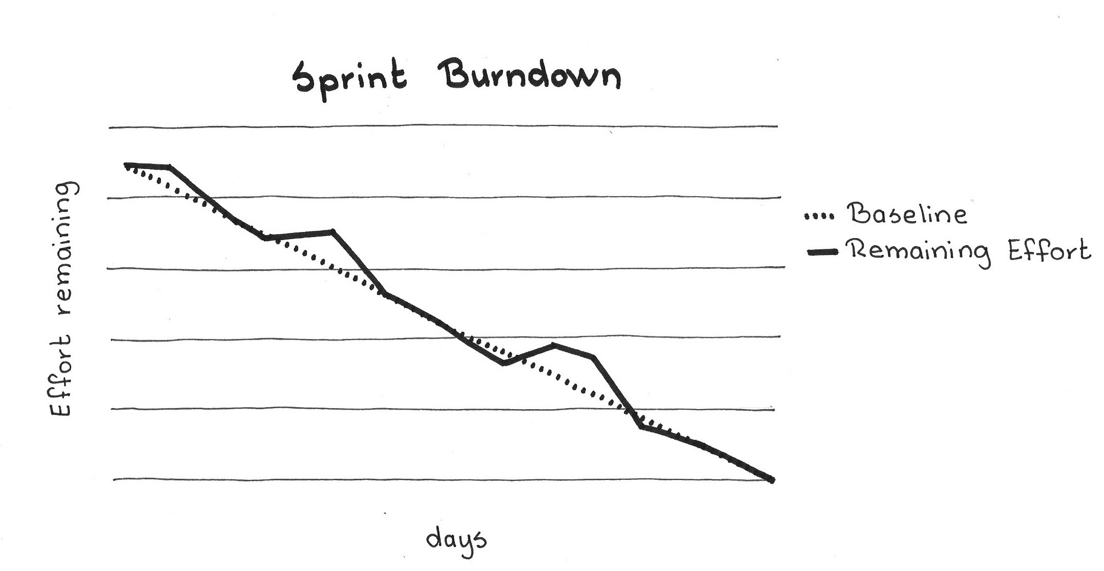 Most Burndown Charts include a reference line for the average burndown rate, drawn from the top of the Y-axis (effort) to the right-most calibration mark of the X-axis (time). The team can compare the trend line of the Sprint’s actual progress against the reference line. If the team finds its progress is significantly above the average burndown rate, then it may conclude it is likely to not deliver the entire Sprint Backlog. If, on the other hand, it is significantly below the average trend line, the Development Team may conclude it has spare capacity in the Sprint. A less simplistic approach would compare the current Sprint’s trajectory against the trajectory for recent Sprints, because the burndown path is rarely linear.