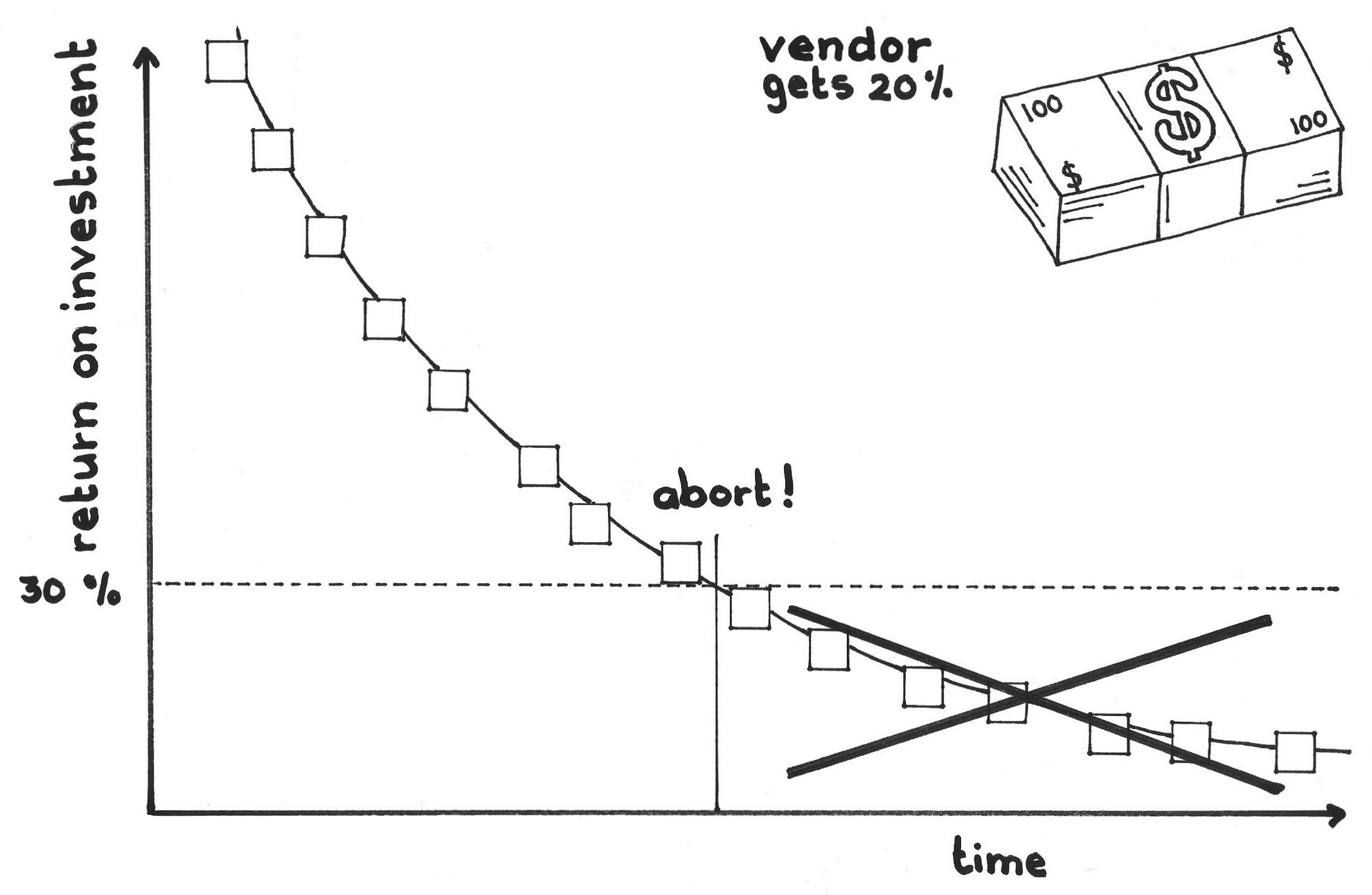 While an early termination penalty in lieu of full payment could reduce both the client’s gross expenditure and net vendor income as well, forcing the vendor to take delivery of and pay for the full feature set also creates ill will. And while a pure pay-as-you go arrangement could optimize the client’s value for cost, it also reduces potential net income to the vendor. However, it also frees the vendor for other engagements whose profitability may be higher than what they could gain by forcing the current client to pay an early termination penalty. The vendor still suffers a small opportunity cost from being idle between the termination of the current agreement and the start of work with a new client. If it is a fixed-cost, fixed-scope agreement, the vendor saves nothing by early termination and is likely to take delivery on those Sprints yielding marginal value, “just in case.” However, the client may ultimately feel the value recovered from the product wasn’t worth the price. The vendor receives full price in this case, but the client may view the vendor as having taken unfair advantage of the imperfect foresight (i.e., that the late product increments would be of low value).