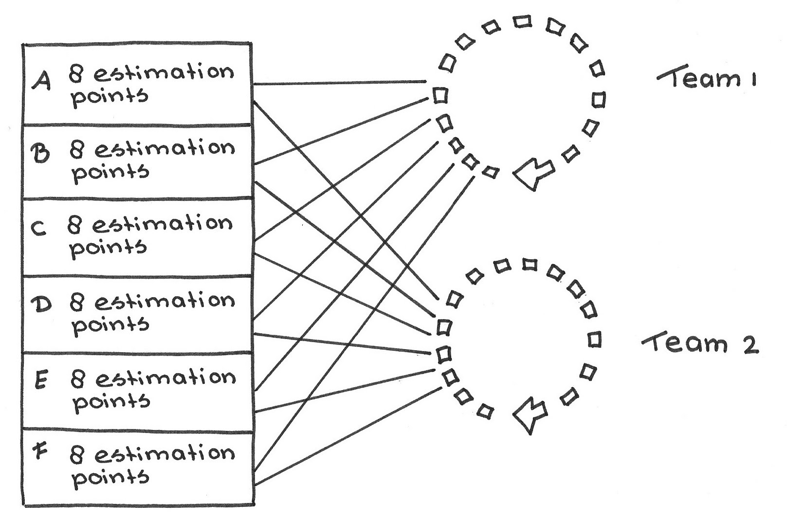 The Aggregate Velocity approach does not depend on specialization and handles the fully general case, albeit at a cost of convening a large meeting. Individual voices tend to get lost in these large meetings, or the meetings bog down because of their size, or time-boxing and other expediencies cut off discussion prematurely. If more voices yearn to be heard, and if you believe there is value in hearing them, it will take more time to collect key insights from a large group than from a small group. And though the time spent eliciting input goes up, the amount of unique insights increases at a disproportionately smaller rate.