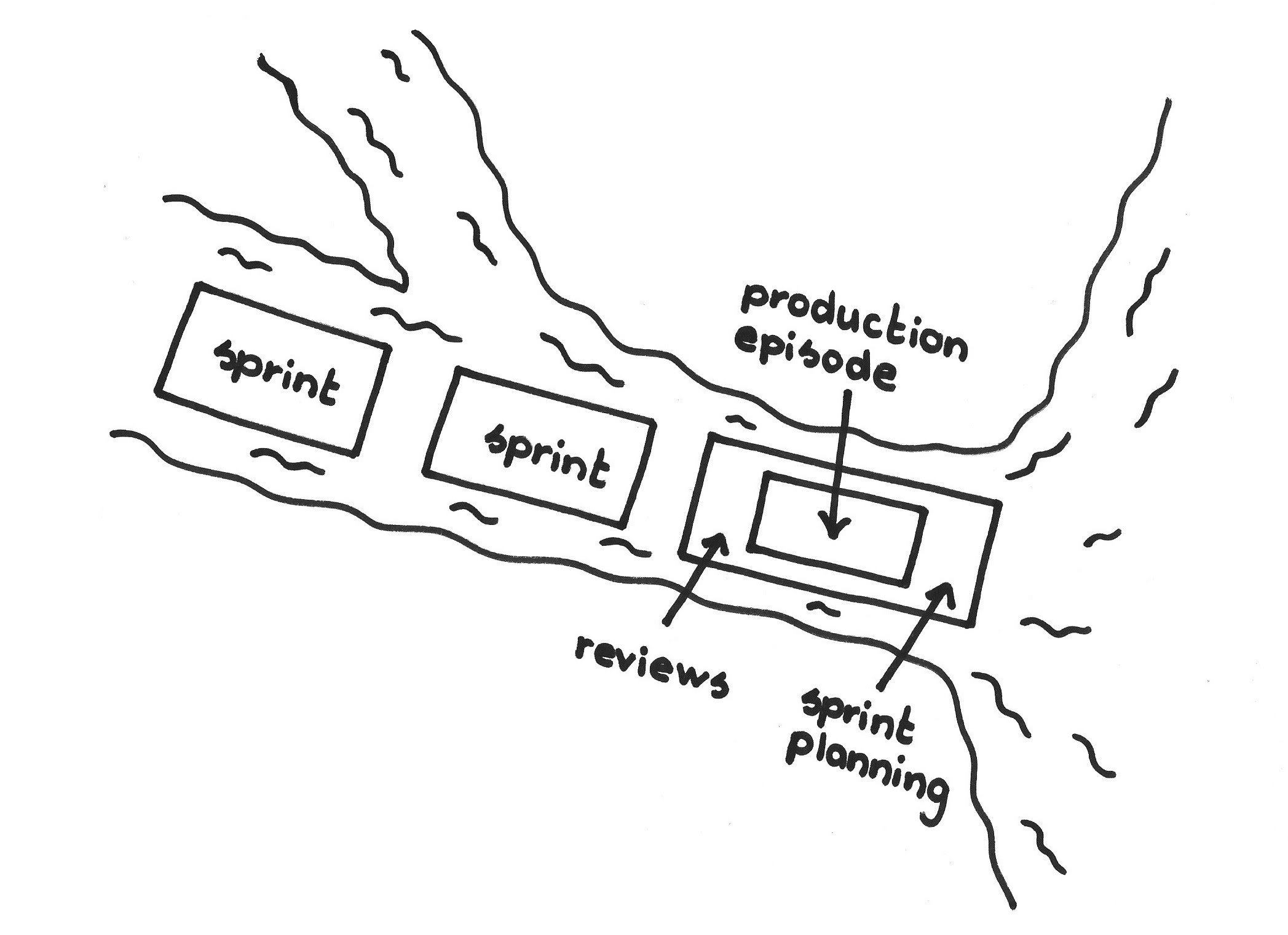 The duration of the Production Episode is the length of the Sprint less the time allotted to Sprint Planning, the Sprint Review, and the Sprint Retrospective. Four weeks is the upper bound on the length of a Sprint, and they typically last two weeks.